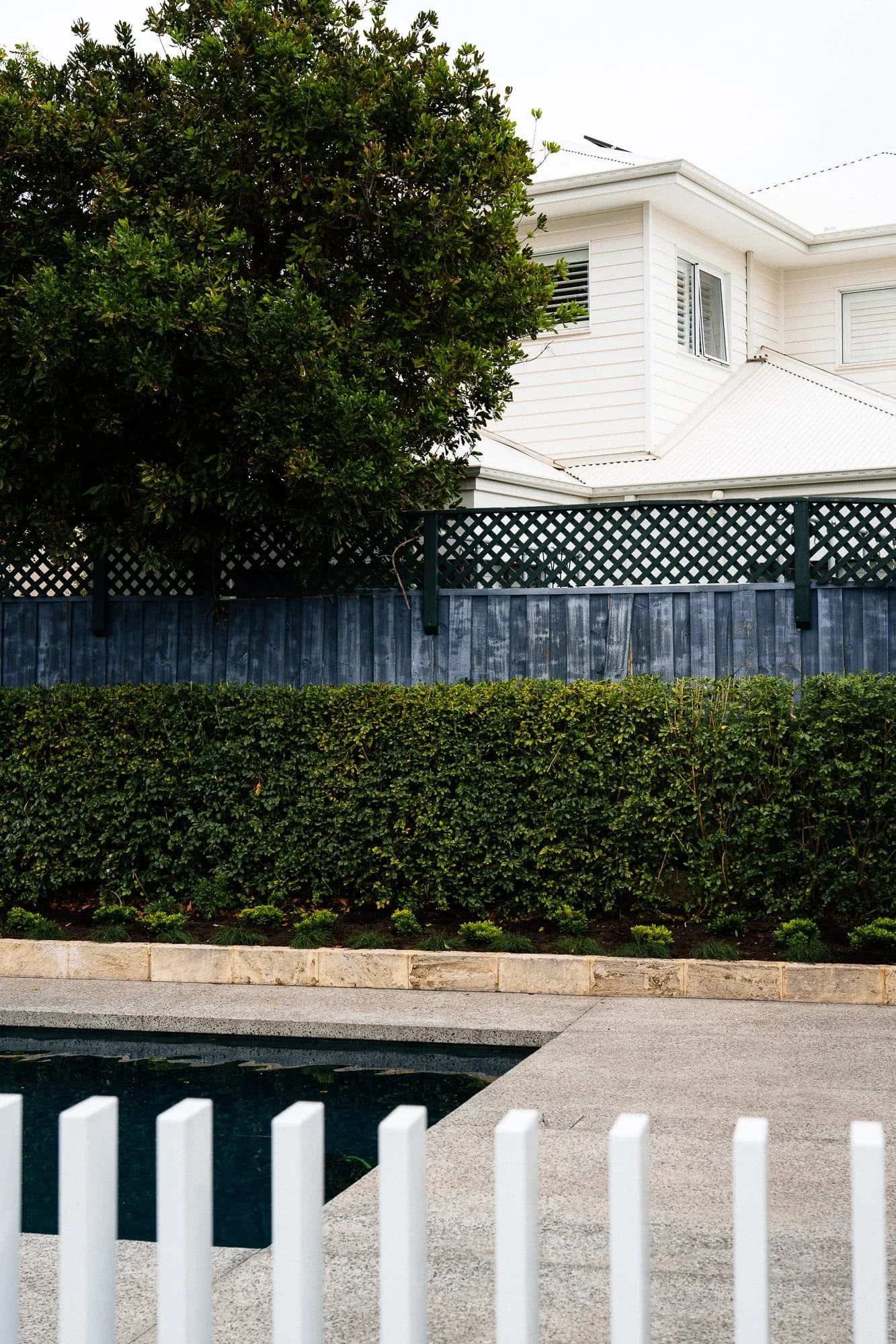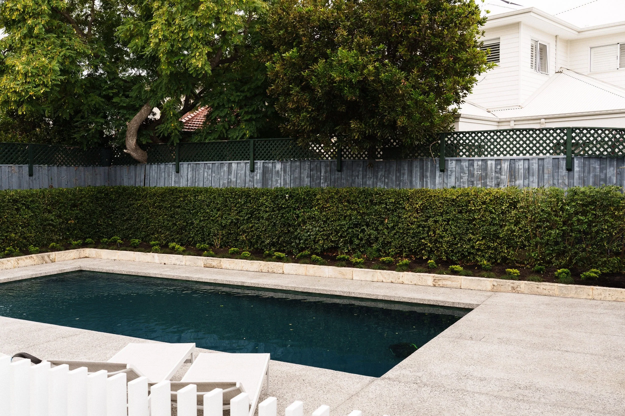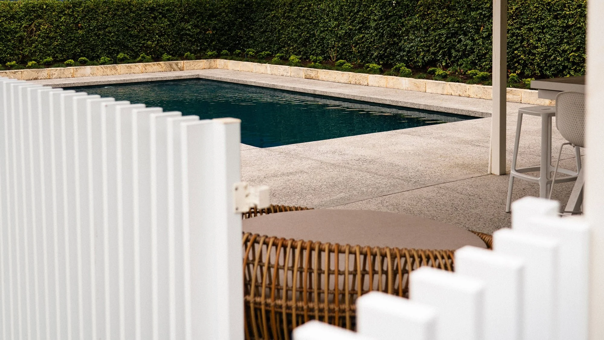 Modern backyard pool area with a stone border and manicured green hedge, viewed through a white vertical slat fence. Wicker outdoor furniture and white patio stools are partially visible under a shaded area.