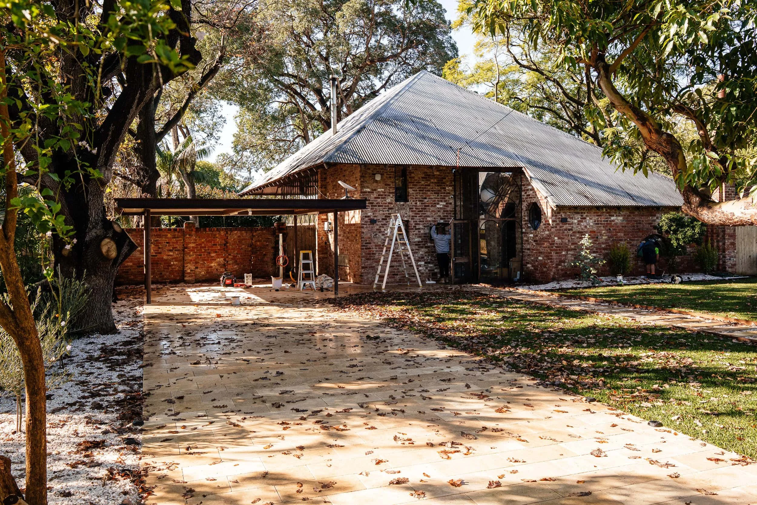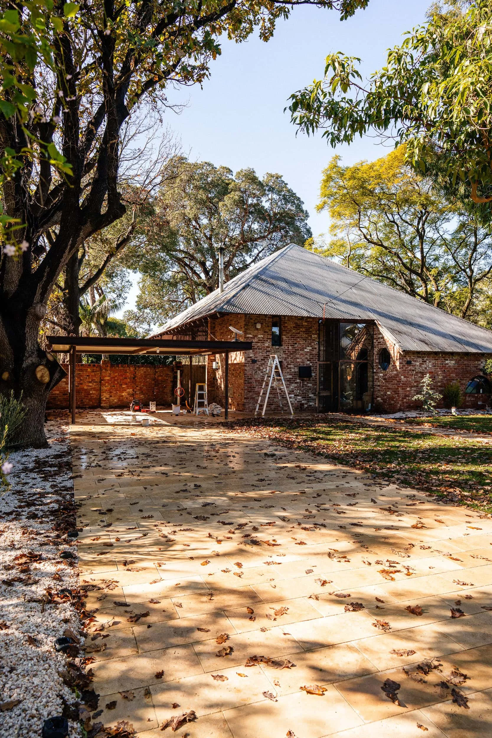 Completed travertine driveway paving project by TerraWest Landscapes in Nedlands. The clean, natural stone surface leads to a brick home surrounded by mature trees, showcasing expert hardscaping craftsmanship.
