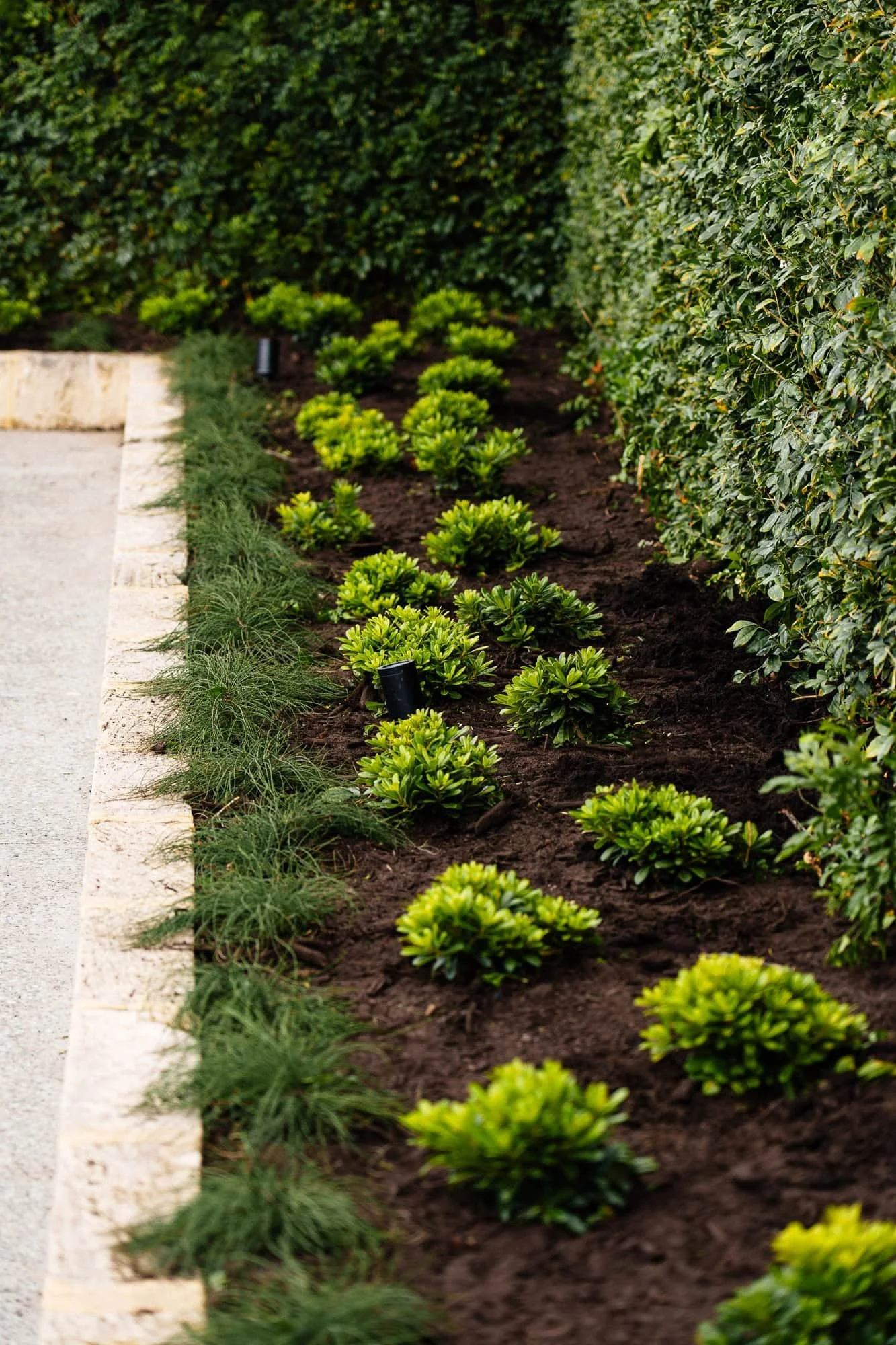 Completed limestone garden bed edging and lush planting by TerraWest Landscapes for a premium backyard pool and entertaining area in Claremont, Perth WA, showcasing elegant outdoor design and high-end landscaping.